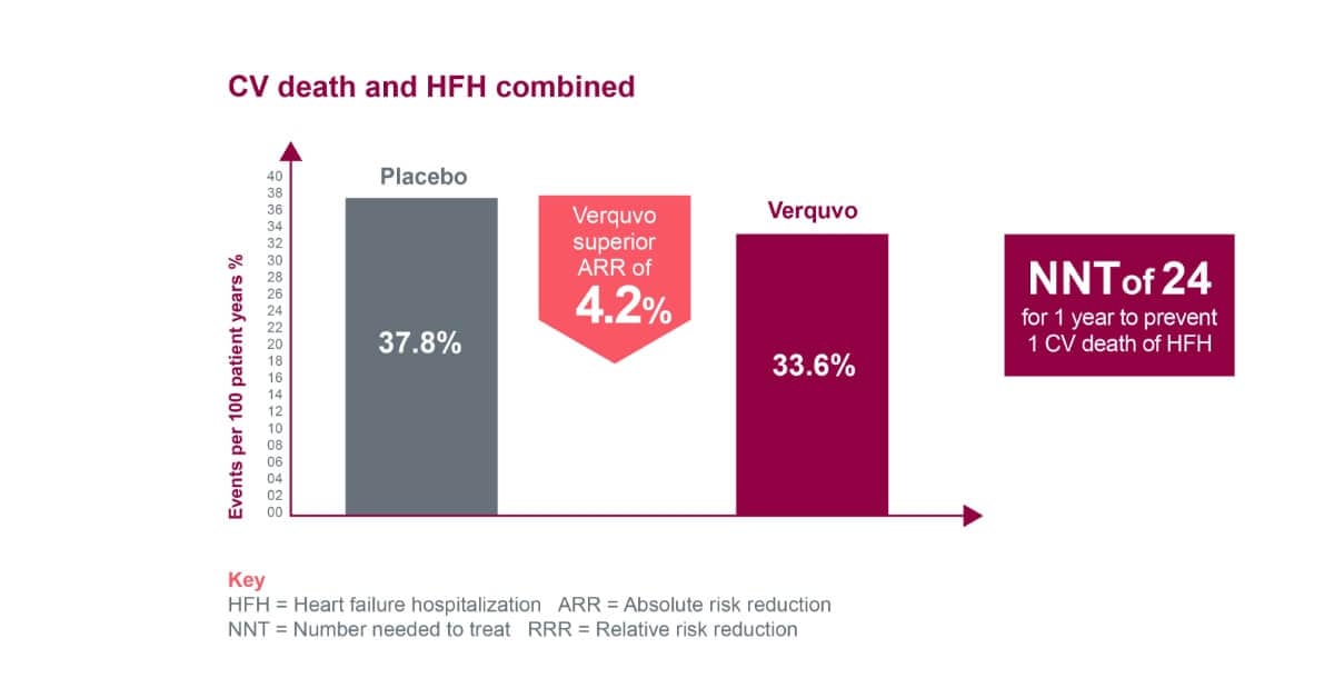 - VERQUVO delivers a superior annual ARR of 4.2% for cardiovascular (CV) death and HF hospitalization combined, compared to background therapies alone.